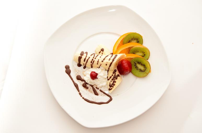 Keywords: bananas strawberries kiwi orange dessert ice cream fruit sweets whipped cream eating sweet dish the sweetness chocolate sweet pastries cocoa tube