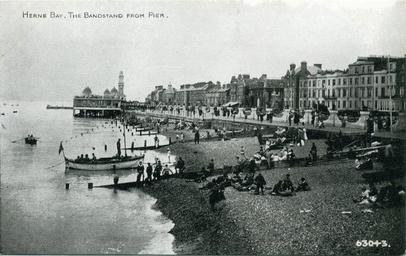 | Keywords: Bandstand Herne Bay 003.jpg Postcard showing a print of Herne Bay Kent England looking east from the third Herne Bay Pier The original photo was probably taken from the promenade deck halfway up the Grand Pier Pavilion or possibly from the roof of the entrance building This shows a special aspect of the pier which was to give an unusual view of the town from the sea for those who had no access to ships The bandstand can be seen along the beach It was published by Photochrom of London and Tunbridge Wells Scan of postcard 1924-1929 Reason for date 1924 first phase of bandstand is visible; 1932 second phase not yet visible; 1920s fashions are being worn anon out of copyright PD-old-70 Herne Bay Pier Postcards of seascapes of the United Kingdom Herne Bay Bandstand |