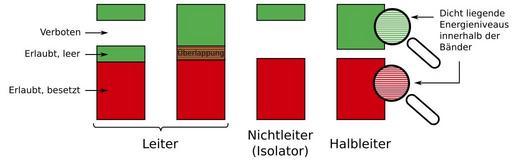 | Keywords: Bandstrukturen-de.svg en Different band structures of solid state bodies Comparison of full empty and prohibited areas in semiconductors small band gap between valence band and conduction band conductor valence band is also condutcion band and not full or both bands overlap and isolator wide band gap de Verschiedene Bandstrukturen der Energiebänder von Festkörpern Im Vergleich Besetzte leere und Verbotene Bereiche bei Halbleiter mit kleiner Bandlücke zwischen Valenzband und Leitungsband Leiter Valenzband gleich Leitungsband nicht voll oder à berlappung beider Bänder und Isolator große Bandlücke own Yoschi 2009-10-01 Bandgap comparisons |