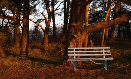 Keywords: bank forest nature pine sun light wooden bench forest path bench rest loneliness silent sunlight