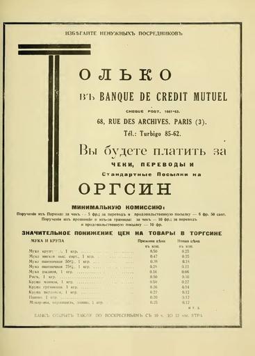 | Keywords: BanqueTorgsin.jpg  ru Реклама банка Banque de Credit Mutuel Пе еводы и посылки на То гсин Па ижский  усский жу нал За  улем N6 октяб ь 1933 http //www archive org/details/zarulemserialauv00andr Author 1933 Economy of the Soviet Union Advertisements in France Rue des Archives Paris 1933 advertisements PD-old |