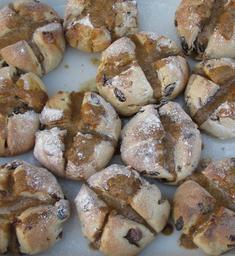 Keywords: Ban'ses Crouaîsies - Hot Cross Buns 3.jpg Des ban'ses crouaîsies grées l'Vendrédi B'nêt 2012 Hot cross buns made on Good Friday 2012 own photo 2012-04-06 16 42 26 Man vyi Breads of Jersey Easter 2012 Hot cross buns