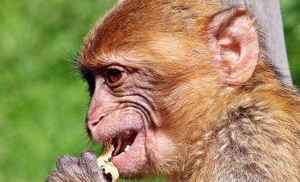 Keywords: barbary ape monkey primate young animal animal portrait nature mammal animal recording wildlife photography close brown head hand exotic creature animal world wild animal peanut eat eat peanut