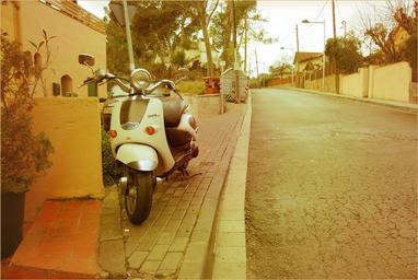 Keywords: barcelona the floresta moto scooter street motorcycle vehicle sidewalk