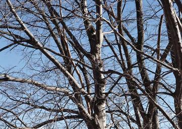 Keywords: winter overhead up outdoor tree stick bud natural spring day atmosphere life leaf change bare stark open season moss forest twig oxygen texture growth blue limb sky barren looking beginning background frond fresh
