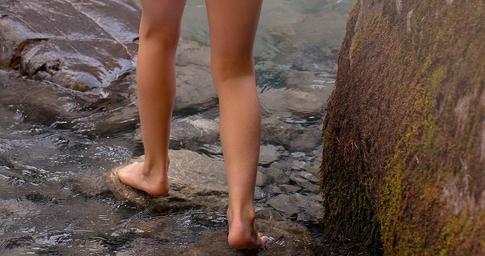 Keywords: barefoot human person feet legs water stones bach nature cooling wet close