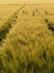 Keywords: barley field away lane tractor tracks traces barley cereals grain cereal cornfield field ear nourishing barley agriculture food
