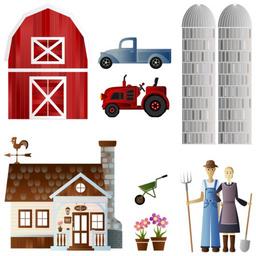 Keywords: barn flowers farm farmer pot silo spade tractor wheelbarrow