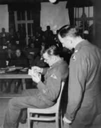 | Keywords: Barnett and Denson.jpeg en Capt John Barnett testifies to the authenticity of photos taken when his troops overran the Dachau concentration camp at the trial of former camp personnel and prisoners from Dachau USHMM courtesy of National Archives and Records Administration College Park Miller 1945-11-24 William Dowdell Denson 1913-1998 U S Chief Prosecutor of Nazi war crimes at the concentration camp trials of Dachau Mauthausen Flossenbuerg and Buchenwald held in Dachau Germany Born and raised in Birmingham Alabama Denson came from a family that had distinguished itself both in military and judicial service After graduating from the U S Military Academy at West Point in 1934 Denson attended Harvard Law School finishing in 1937 He then returned to Birmingham where he started a private law practice In 1942 Denson was invited back to West Point to serve as both a law instructor and the Assistant Staff Judge Advocate to the Superintendent of the U S Military Academy In January 1945 Denson accepted the position of Judge Advocate General JAG in Europe and was assigned to Third Army headquarters in Germany While stationed in Freising Germany Denson read about the liberation of Dachau in the army newspaper Stars and Stripes After taking part in more than 90 trials against Germans who had committed atrocities against downed American pilots Denson was promoted to lieutenant colonel and in August 1945 was called to serve as the Chief Prosecutor for the U S government at the Dachau concentration camp war crimes trial As a result of his success in handling the trial he was asked to serve as chief prosecutor for a series of concentration camp trials including Mauthausen Flossenbuerg and Buchenwald When these trials came to an end in early 1947 Denson returned to Birmingham but soon moved to Washington DC to accept a position as co-chief legal counsel to the Atomic Energy Commission In 1949 Denson married Countess Constance von Francken-Sierstorpff of Southampton Long Island with whom he had three children In 1958 the family relocated to New York where Denson went to work for a major law firm Later in 1980 he became senior litigator in a small firm in Mineola N Y Denson remained in New York until his death at the age of 85 Sources Denson William Justice in Germany Memories of the Chief Prosecutor Mineola N Y Meltzer Lippe et al P C 1995; Greene Joshua Justice at Dachau New York Broadway Books 2003 pp 17-20; 320-356 The Dachau concentration camp trial opened on November 2 1945 in Dachau Germany Forty individuals who had participated in the operation of the Dachau concentration camp were charged with the murder and mistreatment of foreign nationals imprisoned there Among those charged were Martin Gottfried Weiss the camp commandant from 1942-1943; Dr Klaus Karl Schilling an SS physician who was brought to Dachau to find a method of immunizing people against malaria; and three former prisoners The trial lasted from November 15 to December 13 1945 with seventy witnesses called for the prosecution and fifty witnesses called for the defense All forty defendants were found guilty with thirty-six being sentenced to death by hanging including Weiss and Schilling one sentenced to hard labor for life and three sentenced to hard labor for ten years A few of the sentences were reduced after a review board determined the defendants were involved to a lesser degree than originally believed but most were upheld Those sentenced to death were hanged on May 28-29 1946 at Dachau PD-USGov Dachau trial Mineola New York |