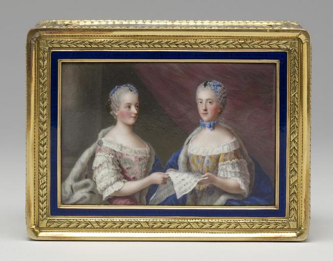 | Keywords: Barriere - Snuffbox with the Family of Louis XV - Walters 57136 - Bottom.jpg The box is decorated with images of the children of Louis XV and Queen Marie Leszczynska Louise-Elizabeth and Marie-Adelaide on the cover ; Victoire-Louise and Sophie-Philippine on the base ; Louis the dauphin with a kite on the front ; Louise-Marie holding a battledore and shuttlecock for a racquet game on the left end ; and Philippe duke of Anjou blowing bubbles on the right end As Philippe died in 1733 the images must be based on earlier portraits between 1761 1762 gold painted enamel cm 5 6 3 accession number 57 136 22517 ZoƩ Victoire Talon Comtesse du Cayla 1785-1852 Paris Maurice Kann Paris Charles J Wertheimer Sale Christie's London May 9 1912 no 14 Jacques Seligmann Paris by purchase Henry Walters Baltimore after 1912 by purchase Walters Art Museum Henry Walters Acquired by Henry Walters after 1912 Objects of Vertu Precious Works of the Eighteenth Century The Walters Art Gallery Baltimore 1984 Vive la France French Treasures from the Middle Ages to Monet The Walters Art Gallery Baltimore 1999-2000 place of origin France Walters Art Museum license Barriere Jeweller J J Dailly Snuffboxs in the Walters Art Museum Portrait miniatures in the Walters Art Museum 18th-century portrait paintings in the Walters Art Museum 1761c House of Bourbon 1761c Princess Victoire of France 1761c Sophie de France 1734-1782 1761c 18th-century family portraits of royalty 1761c 18th-century portrait paintings of women at half length 1761c Females with chokers in art 1761c Lace sleeves in art 1761c Portraits of sisters 1761c Portraits with musical scores 1761c Vive la France French Treasures from the Middle Ages to Monet |