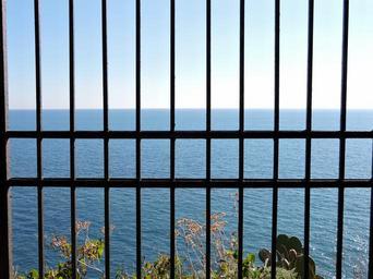 Keywords: bars sea iron back sky water prison