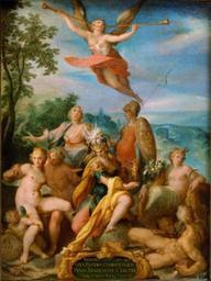 | Keywords: Bartholomäus Spranger 018.jpg Artwork de Allegorie auf Kaiser Rudolf II de Kupfer de 23 x 17 cm Rahmenmaße 32 x 26 x 3 5 cm de Wien de Kunsthistorisches Museum Gemäldegalerie de Signatur Bez links unten auf dem Stein B S 1592 Beschriftung Auf einer Inschrift RVDOLPHO II CAES AVG / DIVA POTENS CHARITESQVE/TVVM DIADEMATE CINCTVM/IAM CAPVT ESSE VELINT Die Figur der Minerva oder Roma mit einer Statuette der Nike in der Hand links von Venus Bacchus und Amor rechts von Ceres umgeben Davor ein männlicher Flußgott Save und rechts Bellona oder Minerva darüber die Figur der Fama Inv -Nr GG_1125 Provenienz Aus der Kunstkammer Rudolfs II Abgebildete Person Kaiser Rudolf II Sohn des Maximilan II von Habsburg Österreich http //bilddatenbank khm at/viewArtefact id 1826 1592 Creator Bartholomäus Spranger Other versions PD-old-100 Paintings by Bartholomäus Spranger in the Kunsthistorisches Museum Rudolf II Holy Roman Emperor Paintings of Athena Tuba angels 1592 paintings Oil on copper 1590s paintings in Austria 16th-century allegorical paintings 16th-century paintings of angels with humans Angels in the air 1590s paintings of angels Paintings of people in nature Mythological paintings in Austria Paintings with Latin inscriptions 1590s paintings from Germany |