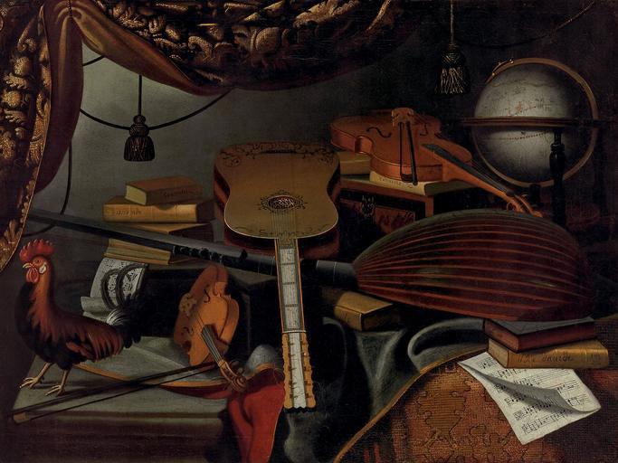 MAKE A MEME View Large Image Bartolomeo Bettera - Still Life with Musical Instruments.jpg Artwork Creator Bartolomeo Bettera Musical instruments books music scores a globe and a rooster on a table draped with a carpet century 17 oil canvas cm 73 96 5 object history b ...