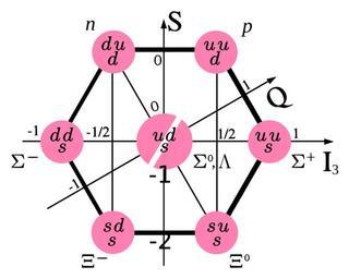 | Keywords: Baryon-octet.svg Premier octet de baryons own 2007-12-20 Trassiorf Trassiorf Image Baryon-octet-small svg The image Baryon-octet-small svg is 20 smaller in dimensions fr Le titre de cette figure est erroné elle représente le premier nonet de baryons Voir Physique des particules Ceci représente le premier octet de baryons regroupés selon le schéma SU 3 « La voie octuple » Sur cette figure reprenant la disposition conventionnelle I<sub>3</sub> est l'axe de la composante d'isospin Q est l'axe de la charge électrique S est l'axe de l'étrangeté « strangeness » Le contenu principal des particules en quarks est noté dans les cercles roses Le cercle rose coupé en deux représente les deux baryons notés en regard Ils se distinguent par diverses propriétés notamment la masse qui ne figurent pas sur ce diagramme en The title of this figure is wrong it represents the first baryon nonet See also en Quark model This shows the first baryon octet grouped according to the SU 3 scheme « Eightfold way » On this figure in the standard layout I<sub>3</sub> is the isospin component axis Q is the electric charge axis S is the strangeness axis The main quark content is indicated within the pink circles The pink circle split in 2 represents the 2 baryons indicated besides They are distinct by several properties notably their mass which are not represented on this diagram de Der Name dieser Abbildung ist falsch sie zeigt das erste Baryon Nonet Siehe auch de Bild Baryonoktett svg welche den gleichen Fehler aufweist Die Abbildung zeigt das erste Baryon Oktett gemäß dem SU 3 Schema Der achtfache Weg in Standarddarstellung I<sub>3</sub> ist die Achse der Isospin Komponente Q ist die Achse der elektrischen Ladung S ist die Strangeness-Achse Der Quarkinhalt wird in den rosa Kreisen gezeigt Der geteilte Kreis zeigt die zwei daneben genannten Baryonen Sie unterscheiden sich in einigen Eigenschaften insbesondere ihrer Masse die nicht in dieser Abbildung dargestellt sind Baryon multiplets |