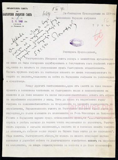 Keywords: BASA-173K-6-1087-56.jpg Изложение от Уп авителния съвет на Бълга ския лека ски съюз до п едседателя на ХХV О С с ещу законоп оекта за защита на нацията 1940-11-05 author ЦДА 173К а одно съб ание 6 1087 56 credit line exhibition history Bulgarian Archives State Agency unknown other versions Anonymous-EU Konstantin Kusitasev Documents in the Bulgarian Archives