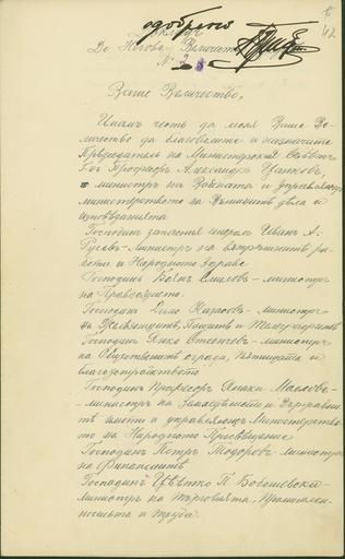 | Keywords: BASA-3K-10-20-42-First Aleksandar Tsankov Government, 1923.jpg Указ 2 на ца Бо ис ІІІ за назначаване на Александъ Цанков за п едседател на инисте ски съвет министъ на войната и министъ на външните аботи и изповеданията Иван А Русев за министъ на вът ешните аботи и на одното зд аве Боян Стоилов за министъ на п авосъдието Димо Казасов на железниците пощите и телег афите Янко Стоенчев обществените сг ади пътищата и благоуст ойството Янако оллов на земеделието и дъ жавните имоти и на на одното п освещение Петъ Тодо ов на финансите Цветко П Бобошевски на тъ говията п омишлеността и т уда First Aleksandar Tsankov Government 1923 1923-06-09 author ЦДА 3K она хически институт 10 20 42 credit line exhibition history Bulgarian Archives State Agency unknown other versions Anonymous-EU Government of Bulgaria |