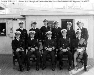 | Keywords: Base Force staff.jpg en Rear Admiral Henry H Hough USN Commander Base Force U S Fleet With officers of his staff on board USS Argonne AS-10 circa 1932 Seated in the front row are left to right Commander Leo L Lindley Aide Force Material Officer; Captain Issac C Kidd Chief of Staff; Rear Admiral H H Hough ComBaseFor; Captain Ellsworth H Van Patten SC Aide Force Supply Officer; and Lieutenant Commander Jacob H Jacobson in charge of Battle Force Camera Party Among those in the rear row are in no particular order Lieutenant Thomas F Darden Jr Aide Flag Secretary; Lieutenant Walter E Moore Aide Force Personnel Officer; and Lieutenant Llewellyn J Johns Aide and Flag Lieutenant http //www history navy mil/photos/images/h82000/h82917 jpg Homer H Cole 1932 Thomas Darden PD-USGov-Military-Navy |