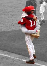 Keywords: baseball player bat boy brothers emotion player hug athlete embrace young kid brotherly love support