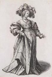 | Keywords: Basel Woman with Ostrich Feather Hat, Costume Study workshop of Hans Holbein the Younger.jpg 29 × 19 6 cm Kunstmuseum Basel The purpose of Holbein's pen-and-wash studies of women from this period is not known though there is a strong emphasis on their clothes This is one of three of the group of six that scholars believe are not by Holbein himself though he is probably responsible for the motif The subject here wears love-knots on her plumed cap Müller pp 300 “301 Institution Kunstmuseum Basel Christian Müller; Stephan Kemperdick; Maryan Ainsworth; et al Hans Holbein the Younger The Basel Years 1515 “1532 Munich Prestel 2006 ISBN 9783791335803 Workshop of Hans Holbein the Younger c 1523/26 PD-Art Kupferstichkabinett im Kunstmuseum Basel 1520s fashion Workshop of Hans Holbein der Jüngere |