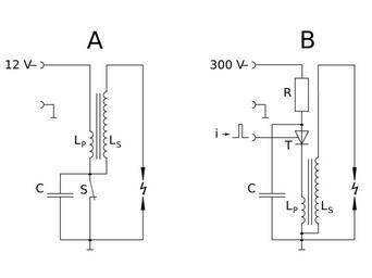 Keywords: Basic ignition coil circuits.svg drawing A with contact breaker; drawing B operated by a thyristor but with 300 V + above own 2007-05-04 Thuringius SVG electrical schematics Ignition circuits