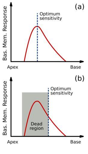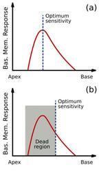 Keywords: Basilar membrane response.svg basilar membrane to a pure tone in a a healthy ear and b an ear with a dead region in the cochlea Own Inductiveload 2009-02-18 SVG files on otology Sensory Neuroscience Hearing and speech