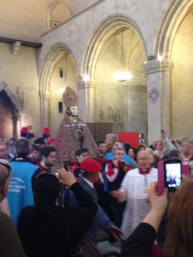 | Keywords: indoor Miracle of Blood - The church houses a vial of the blood of Saint Januarius which is brought out twice a year, on the first Saturday in May and on 19 September, when the dried blood usually liquefies. If the blood fails to liquefy, then legend has it that disaster will befall Naples We were there on this day and fortunately it did liquefy. Later that day patrons carry 45 patron saints from the Duomo to this church. Miracle of Blood - The church houses a vial of the blood of Saint Januarius which is brought out twice a year, on the first Saturday in May and on 19 September, when the dried blood usually liquefies. If the blood fails to liquefy, then legend has it that disaster will befall Naples We were there on this day and fortunately it did liquefy. Later that day patrons carry 45 patron saints from the Duomo to this church. |
