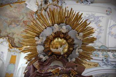 | Keywords: Basilika Vierzehnheiligen 028.JPG Die Basilika Vierzehnheiligen bei Bad Staffelstein im Landkreis Lichtenfels ist eine Wallfahrtskirchen in Oberfranken <br>The decorations underneath the sounding board above the pulpit Basilica of the Fourteen Holy Helpers Bad Staffelstein near Bamberg in Bavaria Germany Own Mattana 2012-06-07 Images by Mattana-Bamberg Germany Vierzehnheiligen pulpit Abat-voix in Bavaria Sculptures of the Holy Spirit as a dove | ||||