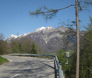 Keywords: BaskaGrapa3.jpg Baška Grapa valley in Slovenia Own 2008-04 Sl-Ziga Bača Ravine Asphalt roads in Slovenia Julian Alps in Slovenia Larix decidua Tree trunks in Slovenia Crash barriers in Slovenia