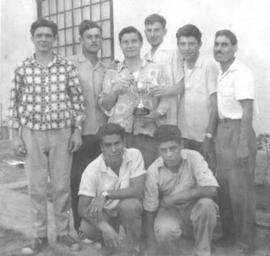 | Keywords: argentina mission basketball sports team people groupshot blackandwhite monochrome black and white Caption: 1958. Basketball team: standing L to R are Arnoldo Casas, Alfredo DeAndrea, Lucio Casas, Carlos DeAndrea, Ramon Basualdo and Otilio Vera. They won the cup in an outdoor game with the Villegas team where Lawrence Brunks are stationed. These two towns are close enough together that the young people can fellowship together often. Those standing have become Christians, but those kneeling have not and are not on the team. Citation: Mennonite Board of Missions. Photographs. Argentina, 1942-1963. IV-10-7.2 Box 1 folder 41, photo #13. Mennonite Church USA Archives - Goshen. Goshen, Indiana. Caption: 1958. Basketball team: standing L to R are Arnoldo Casas, Alfredo DeAndrea, Lucio Casas, Carlos DeAndrea, Ramon Basualdo and Otilio Vera. They won the cup in an outdoor game with the Villegas team where Lawrence Brunks are stationed. These two towns are close enough together that the young people can fellowship together often. Those standing have become Christians, but those kneeling have not and are not on the team. Citation: Mennonite Board of Missions. Photographs. Argentina, 1942-1963. IV-10-7.2 Box 1 folder 41, photo #13. Mennonite Church USA Archives - Goshen. Goshen, Indiana. |