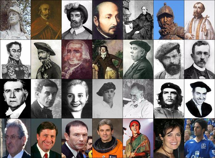 | Keywords: Basque people.png Basque descent by order of birth<br /> 1<small><sup>st</sup></small> row Íñigo Arista - Sancho III of Navarre - Juan Sebastian Elcano - Ignacio de Loyola - Andrés Urdaneta - Juan de Oñate - Francis Xavier<br /> 2<small><sup>nd</sup></small> row Simón Bolívar - Tomas Zumalacárregi - Don Diego de Gardoqui- Dominique Joseph Garat - Biktoriano Iraola - Sabino Arana Goiri - Federico Errázuriz Echaurren<br /> 3<small><sup>rd</sup></small> row Emílio Garrastazu Médici - Maurice Ravel - Eva Perón - Atano VII - Nestor Basterretxea - Ernesto Che Guevara -Luis Mariano<br /> 4<small><sup>th</sup></small> row Pedro Miguel Echenike - John Garamendi - Juan José Ibarretxe - Léopold Eyharts - Manu Chao - Estitxu Fernandez - Mikel Arteta Amatrain<br /> Seven of them belong to the Basque diaspora 3 images transferred from http //en wikipedia org English wikipedia<br/> 1 image transferred from http //eu wikipedia org Basque wikipedia<br/> self-made from cropped versions of <gallery> Image Íñigo Arista head jpg Eneko Arista 790-852 First King of Pamplona <br /><u>Permission </u> Permission is granted to copy distribute and/or modify this document under the terms of the GNU Free Documentation license Version 1 2 Image Don-sancho-el-mayor -rizzi jpg Sancho III of Navarre 1004-1035 King of Navarre<br /><u>Permission </u>Copyleft This work of art is free; you can redistribute it and/or modify it according to terms of the Free Art License You will find a specimen of this license on the site Copyleft Attitude http //artlibre org/licence/lal/en/ as well as on other sites Image Elcano jpg Juan Sebastian Elkano 1486-1526 Naval commander <br /><u>Permission </u> Public domain because its copyright has expired Image Ignatius_Loyola jpg Ignacio de Loyola 1491-1556 Founder and first Superior General of the Society of Jesus <br /><u>Permission </u> This image or other media file is in the public domain because its copyright has expired This applies to the United States Canada the European Union and those countries with a copyright term of life of the author plus 70 years Image Andres de Urdaneta jpg Andres Urdaneta 1498-1568 Augustinian friar sail-captain and explorer <br /><u>Permission </u> This image or other media file is in the public domain because its copyright has expired This applies to the United States Canada the European Union and those countries with a copyright term of life of the author plus 70 years File NEW MEXICO San Juan Pueblo DonJuan De Onate First Govenor of New Spain jpg Juan de Oñate 1552-1626 Explorer colonial governor of the New Spain <br /><u>Permission </u>I the creator of this work hereby grant the permission to copy distribute and/or modify this document under the terms of the GNU Free Documentation License Version 1 2 or any later version published by the Free Software Foundation; with no Invariant Sections no Front-Cover Texts and no Back-Cover Texts Subject to disclaimers File Conversion of Paravas by Francis Xavier in 1542 jpg Cropped version of this image<br />Francis Xavier 1506 1552 was a pioneering Roman Catholic missionary <br /><u>Permission </u> This image or other media file is in the public domain because its copyright has expired This applies to the United States Canada the European Union and those countries with a copyright term of life of the author plus 70 years Image Hw-bolivar jpg Simón Bolívar 1783-1830 General et polititian <br /><u>Permission </u> This image or other media file is in the public domain because its copyright has expired This applies to the United States Canada the European Union and those countries with a copyright term of life of the author plus 70 years Image Zumalacarregui gif Tomas Zumalakarregi 1788-1835 General <br /><u>Permission </u> This image or other media file is in the public domain because its copyright has expired This applies to the United States Canada the European Union and those countries with a copyright term of life of the author plus 70 years Image Noimage svg Cropped version of en File DonDiegoGardoqui jpg<br />Don Diego de Gardoqui 1735-1798 Politician and diplomat <br /><u>Permission </u> This image is in the public domain because its copyright has expired in the United States and those countries with a copyright term of no more than the life of the author plus 100 years Image Dominique Joseph Garat JPG Dominique Joseph Garat 1749-1833 Writer and politician <br /><u>Permission </u>This image or other media file is in the public domain because its copyright has expired This applies to the United States Canada the European Union and those countries with a copyright term of life of the author plus 70 years Image SabinoAranaTxapeldun jpg Sabino Arana Goiri 1865-1903 Writer and Basque nationalist <br /><u>Permission </u> This image or other media file is in the public domain because its copyright has expired This applies to the United States Canada the European Union and those countries with a copyright term of life of the author plus 70 years Image ErrazurizEchaurrenFederico jpg Cropped version of this image<br />Federico Errázuriz Echaurren 1850-1901 President of Chile <br /><u>Permission </u> This image or other media file is in the public domain because its copyright has expired This file has fallen into the public domain according to Chilean Law 17 336 and its amendments Nevertheless its author and source must be acknowledged See here for the type of material that are in the Public domain Image Garrastazu médici jpg Emílio Garrastazu Médici 1905-1985 31st President of Brazi<br /><u>Permission </u>This photograph was produced by Agência Brasil a public Brazilian news agency Their website states O conteúdo deste site é publicado sob a licença Creative Commons Atribuição 2 5 Brasil The content of this website is published under the Creative Commons License Attribution 2 5 Brazil Image Maurice Ravel 1912 jpg Cropped version of this image<br />Maurice Ravel 1875-1937 Composer and