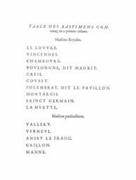 | Keywords: Bastiments v1 (Gregg 1972 p03) - TOC.jpg Page of text with the table of contents from Le premier volume des plus excellents Bastiments de France by Jacques I Androuet du Cerceau <br /><--previous page Space 10 next page--> Scan Androuet Jacques 1576 Le premier volume des plus excellents Bastiments de France Paris Reduced size reprint Gregg International 1972 ISBN 9780576154086 1576 Creator Jacques I Androuet du Cerceau PD-old-100 Le premier volume des plus excellents Bastiments de France Gregg 1972 reprint |