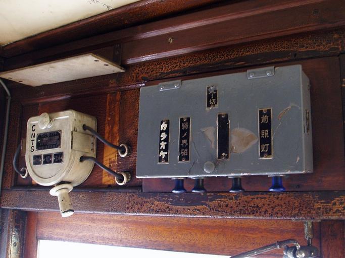 | Keywords: BATADEN Dehani52 cab switch.jpg en Electrical switch of EMU Type Dehani-50 No 52 by Ichibata Electric Railway BATADEN ja 畑電車デハニ52の運転台にある電源スイッチ カラオケ はお座敷電車として使用されていたときに追加されたもの Photo by Cassiopeia_sweet with permission Cassiopeia_sweet 2010-10-18 Load switches Ichibata Dehani 50 series |