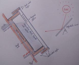 | Keywords: BatchSolarHeater.JPG en A solar heater taken from the design noted in Earthship Volume 2 Systems and components by Michael Reynolds The solar heater should be initially positioned perpendicular to to spring or summer sun equinox if used as is or at a 90 degree angle from the mirror targeted at equinox sun Water intake and outlet are to be equipped with valves Can be set-up so it is totally gravity fed and requires no pumps Can be easily build DIY at low cost Only usable in areas with allot of sun subtropics Originally designed for showering but may accommodate other uses if hooked up to the houses' piping system For the elevation; the initial design by Michael Reynolds simply placed the water heater at an angle equal to the line of the roof However the optimal angle differs for each location and even during the coarse of the year see http //www macslab com/optsolar html Thus the solar collector is best placed on a adjustable tiltable platform In addition it is also best that the platform can be rotated to the sun to track the sun during the day Both are not essential for showering since a person can simply change his lifestyle to shower at a moment when the collector has warmed up the most For other purposes connecting the system to ie the hot water system a rotatable/tiltable platform is advised In regards to the hot/cold water inlet; this is correct though noticable different from other solar collectors This because I wanted the collector to also function with water that wasn't pressurised ie cold water simply flowing into the collector via gravity aswell as out via gravity This can not be done if inlet/outlet are switched If you were to change the hot/cold water inlet/outlet then you could only shower for say 1 minute and then the hot water no longer flows out as it doesn't reach the upper outlet no more water mass drops during showering Thus this setup is for this purpose the best one However since hot water rises to the top as is this does give problems with circulating pressurised systems since the hot water outlet is placed entirely at the bottom However for showering this doesn't matter since you can simply wait untill the entire tank has warmed up sufficiently the colder water at the bottom thus still being warm enough for showering I guess that a thermometer would need to be included for this though To resolve the hot water/cold water issue with the circulating pressurised systems the hot water outlet and inlet needs to be simply swapped when using these collectors for this purpose Own KVDP 2008-08-28 Michael Reynolds architect |