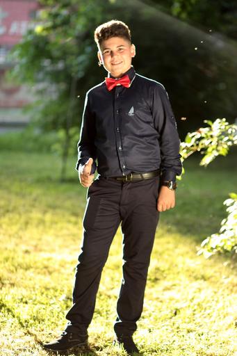Keywords: bath bow tie young sympathetic smile