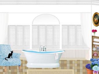 Keywords: bathroom bath windows armchair tiled tiles rug oval frame vase of flowers black cat flower pots drapes trim ogees light