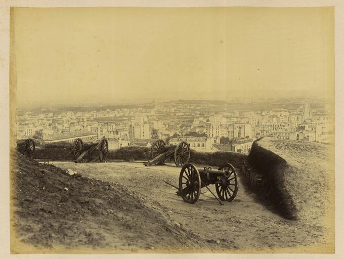 | Keywords: Battery of the Montmartre Hills WDL1246.png Artwork ru Б аквейе Б уно 1823 1875 гг fr Braquehais Bruno 1823-1875 en Braquehais Bruno 1823-1875 zh 布鲁诺·布拉奇海 ,1823-1875 年 pt Braquehais Bruno 1823-1875 ar براكهيه برونو، 1823-1875 es Braquehais Bruno 1823-1875 ru Бата ея на холмах онма т а fr Batterie des buttes Montmartre en Battery of the Montmartre Hills zh 蒙马特山的炮台 pt Bateria das colinas Montmartre ar مدفعية تلال مونمارتر ru П ичиной ф анко-п усской войны стал ост нап яженности в отношениях между Ф анцией и П уссией в 1860-х гг Ф анция п и импе ато е аполеоне III была полна ешимости п ове ить астущую силу П уссии и отомстить за то что она ассмат ивала как яд дипломатических унижений П уссия п и канцле е Отто фон Бисма ке считала что война ге манских госуда ств п отив Ф анции под уководством П уссии станет ешающим шагом к созданию единой Ге манской импе ии Конфликт начался 19 июля 1870 г когда Ф анция объявила войну Ф анцузская а мия оказалась ужасно неподготовленной и поте пела сок ушительное по ажение в битве п и Седане отк ыв до огу на Па иж К 19 сентяб я немцкие войска полностью ок ужили го од и начали осаду кото ая п одлилась более четы ех месяцев От езанные от поставок п одовольствия из сельской местности па ижане пытались выжить питаясь собаками кошками и даже животными из па ижского зоопа ка Де евья на Елисейских полях и в па ках были вы ублены и использованы в качестве топлива 5 янва я немецкие войска начали бомба ди овку го ода кото ая п одолжалась по несколько часов каждую ночь в течение 23 суток а ок естности Па ижа было сб ошено около 12 000 сна ядов кото ые убили около 400 человек Па иж сдался 28 янва я в сущности положив конец войне За по ажением ф анцузов последовало на одное восстание и установление в а те 1871г Па ижской коммуны еволюционного п авительства сфо ми ованного в соответствии с ана хистскими и социалистическими п инципами Коммуна была жестоко подавлена в мае 1871 г ф анцузскими войсками п авительства Адольфа Тье а Во в емя неп одолжительного конт оля над Па ижем коммуна ы аз ушали импе ато скую колонну на Вандомской площади Подавление коммуны п ивело к дальнейшим значительным аз ушениям в го оде когда коммуна ы подожгли дво ец Тюиль и Лув и д угие здания К оме того многие здания пост адали или были аз ушены во в емя отчаянной пе ест елки между коммуна ами и конт еволюционными силами Siege de Paris 1870 1871 Осада Па ижа 1870 1871 гг п едставляет собой альбом из 110 фотог афий сделанных Огюстом Б уно Б аквейе 1823 1875 гг ф анцузским фотог афом и п ог ессивным фотожу налистом документи овавшим осаду и последствия бомба ди овок а также аз ушения п оизошедшие во в емя Па ижской коммуны <br>Боеп ипасы; Ба икады; Пушки; Го ода и поселки; Ф анко-п усская война 1870 1871 гг ; Память ми а fr La guerre franco-allemande fut provoquée par l escalade des tensions entre la France et la Prusse dans les années 1860 La France sous l empereur Napoléon III était déterminée à contenir la croissance de la puissance prussienne et à venger ce qui était considéré comme une série d humiliations diplomatiques La Prusse sous le chancelier Otto von Bismarck considérait qu une guerre dirigée par la Prusse et menée par les États allemands contre la France serait un acte décisif menant à la création d un empire allemand unifié Le conflit débuta le 19 juillet 1870 jour où la France déclara la guerre L armée française s avéra terriblement mal préparée et subit une défaite désastreuse lors de la bataille de Sedan laissant la voie libre vers Paris Le 19 septembre les Allemands encerclèrent complètement la ville et commencèrent un siège qui allait durer plus de quatre mois Coupés du ravitaillement provenant de la campagne les Parisiens survécurent en mangeant les chiens les chats et même la plupart des animaux du zoo de Paris Les arbres des Champs-Élysées et des parcs furent coupés et brûlés pour servir de combustible Le 5 janvier les armées allemandes entreprirent le bombardement de la ville qui dura plusieurs heures chaque nuit durant 23 nuits Environ 12 000 obus tombèrent sur les quart