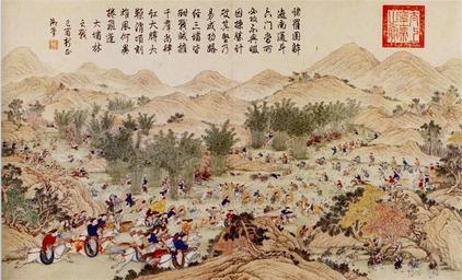 | Keywords: Battle at Dabulin.jpg en Battle of Dabulin part of the Campaign against Taiwan 1787-1788 zh-hans 平定台湾战役之 大埔林之战 http //www battle-of-qurman com cn/e/hist htm late XVIII century A collaboration between Chinese and European painters The Jesuit missionaries involved in producing the drawings in China were Giuseppe Castiglione Jean-Denis Attiret Ignace Sichelbart and Jean Damascene The engravings were executed in Paris under the direction of Charles-Nicolas Cochin of the Académie Royal at the Court of Louis XVI and the individual engravers include Le Bas Aliamet Prevot Saint-Aubin Masquelier Choffard and Launay PD-Art Military of Qing China Ten Great Campaigns Paintings of the Qing Dynasty |