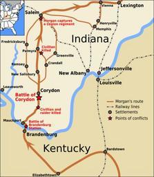 | Keywords: Battle of Corydon with Morgan's Raid in southern Indiana.svg en A map showing the detailed course of Morgan's raid before and after the Battle of Corydon The thick brown line represents the main body of troops with smaller lines representing detachments sent to raid the countryside Battle_of_Corydon_with_Morgan's_Raid_in_southern_Indiana_copy jpg File Blank US map borders svg and File USA location map svg for the general US map in the upper left corner File Map of Morgan's Raid jpg for railway lines and general movements Funk Arville L ©1969 revised 1983 A Sketchbook of Indiana History Rochester Indiana Christian Book Press page 87 for troop movements 2009-07-04 06 31 UTC Battle_of_Corydon_with_Morgan's_Raid_in_southern_Indiana_copy jpg Charles Edward derivative work Jappalang <span class signature-talk >talk</span> Maps of Indiana</nowiki> 2008-11-03T15 36 21Z Charles Edward 600x691 219665 Bytes <nowiki> Maps of Indiana</nowiki> 2008-11-03T14 22 50Z Charles Edward 600x691 200949 Bytes <nowiki> en A map showing the detailed course of Morgan's raid before and after the Battle of Corydon Thick line represents the main body of troops with smaller lines representing detachments sent to r</nowiki> Uploaded with derivativeFX Morgan's Raid Maps of Indiana Maps of the Battle of Corydon |