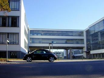 Keywords: bauhaus bauhaus building dessau gropius modern germany glass front sky blue building vw beetle volkswagen new beetle vw convertible