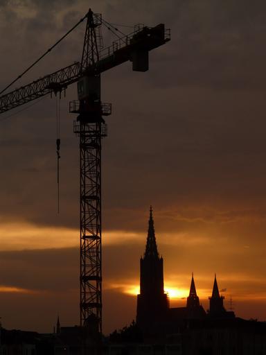 Keywords: baukran crane construction sites build site construction work technology sunset ulm cathedral münster dom cathedral architecture building high church steeple abendstimmung