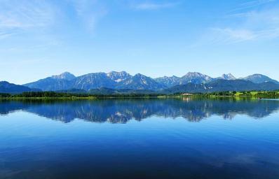 Keywords: bavaria allgäu lake mountains water nature germany summer leisure holiday recovery idyll horizontal in the free rest landscape blue morning