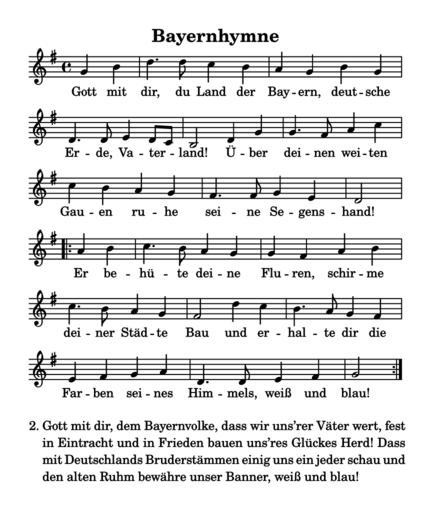Keywords: Bayernhymne.svg de Die Bayernhymne in der Form wie sie in der Bayerischen Verfassung steht en The Hymn of Bavaria as printed in the Bavarian constitution 2011-10-19 Selbst erstellt nach dem Notenblatt in der Verfassung des Freistaates Bayern Melodie Max Kunz; Urtext Michael Oechsner PD-old-100 Anthems Symbols of Bavaria Sheet music