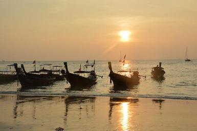 Keywords: beach boats thailand boot ship water sea sunset abendstimmung ocean sun twilight setting sun dusk sky holiday golden atmospheric romance