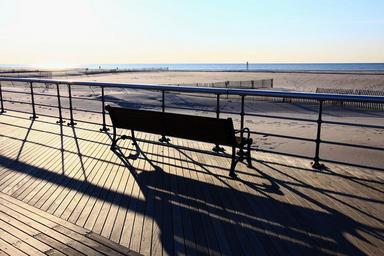 Keywords: beach daybreak dawn sunrise ocean boardwalk bench shadow light sun