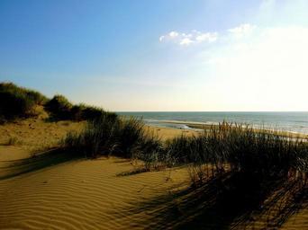 Keywords: beach dunes sand grass sunset ocean sea water netherlands vacation coast shore scenic sunlight shoreline