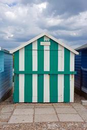 Keywords: beach hut beach house wooden beach house hut sky holiday outdoors coast building seaside nobody colours stripes striped green white painted clouds cloudy stormy cabin image