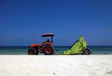 Keywords: beach maintenance cleaning tractor sargo sand sea water costa landscape cancun beach sand turquoise ocean work