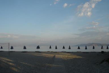Keywords: beach morning sunrise holiday parasols sea greece sand
