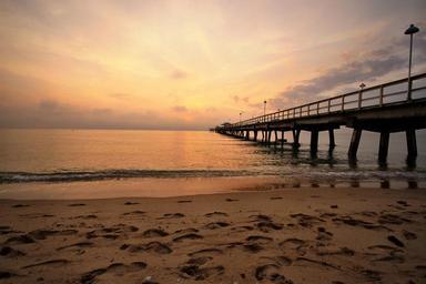 Keywords: beach pier sunrise ocean sea travel water summer sky coast vacation sand nature sun sunrise beach scenic holiday outdoor dock waves seaside usa dusk relax