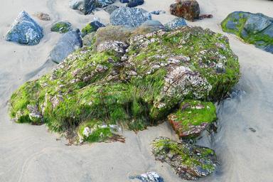 Keywords: beach rock stone moss seaweed nature sea water ocean sand summer beach sand green seashore shore seaside coast